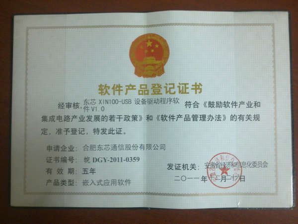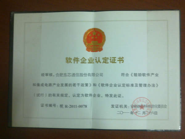 合肥东芯通信股份有限公司于2011年顺利通过国家信息产业部“双软企业”认证,获得了由安徽省经济和信息化委员会颁发的《软件企业认定证书》和《软件产品认定证书》。 “双软”证书的取得,充分表明了我公司软件开发技术力量的雄厚和管理的规范化,使公司获得了更加良好的企业形象,增强了公司对人才等各种资源的吸引力。这将为为公司实现跨越式发展奠定良好的基础,也将为公司今后的高速持续发展提供有力支持。